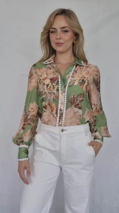 This blouse is a charming blend of romantic and modern styles. The soft sage green fabric is adorned with a delicate floral print featuring blush-toned roses and leaves. The long sleeves and relaxed fit create a comfortable and feminine silhouette. The white pearl trim along the placket adds a touch of understated elegance, while the slightly puffed sleeves lend a touch of contemporary flair.