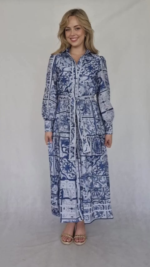 Indulge in luxurious style with this stunning maxi dress featuring a captivating chinoiserie pattern in navy and white. The tailored button-up bodice, complete with a self-tie belt, perfectly complements the layered, flowing skirt. With its long sleeves and elegant design, this dress creates a refined and flattering silhouette, making it the ideal choice for both daytime and evening occasions.