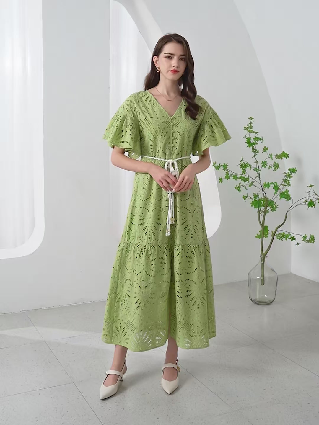 Step into a world of elegance with the stunning Margot Cotton Long Dress, adorned with intricate eyelet embroidery. The contrasting braided self-tie belt adds a touch of boho charm, while the exaggerated cap sleeves gracefully drape the shoulders, creating a look that is both chic and captivating. – lined