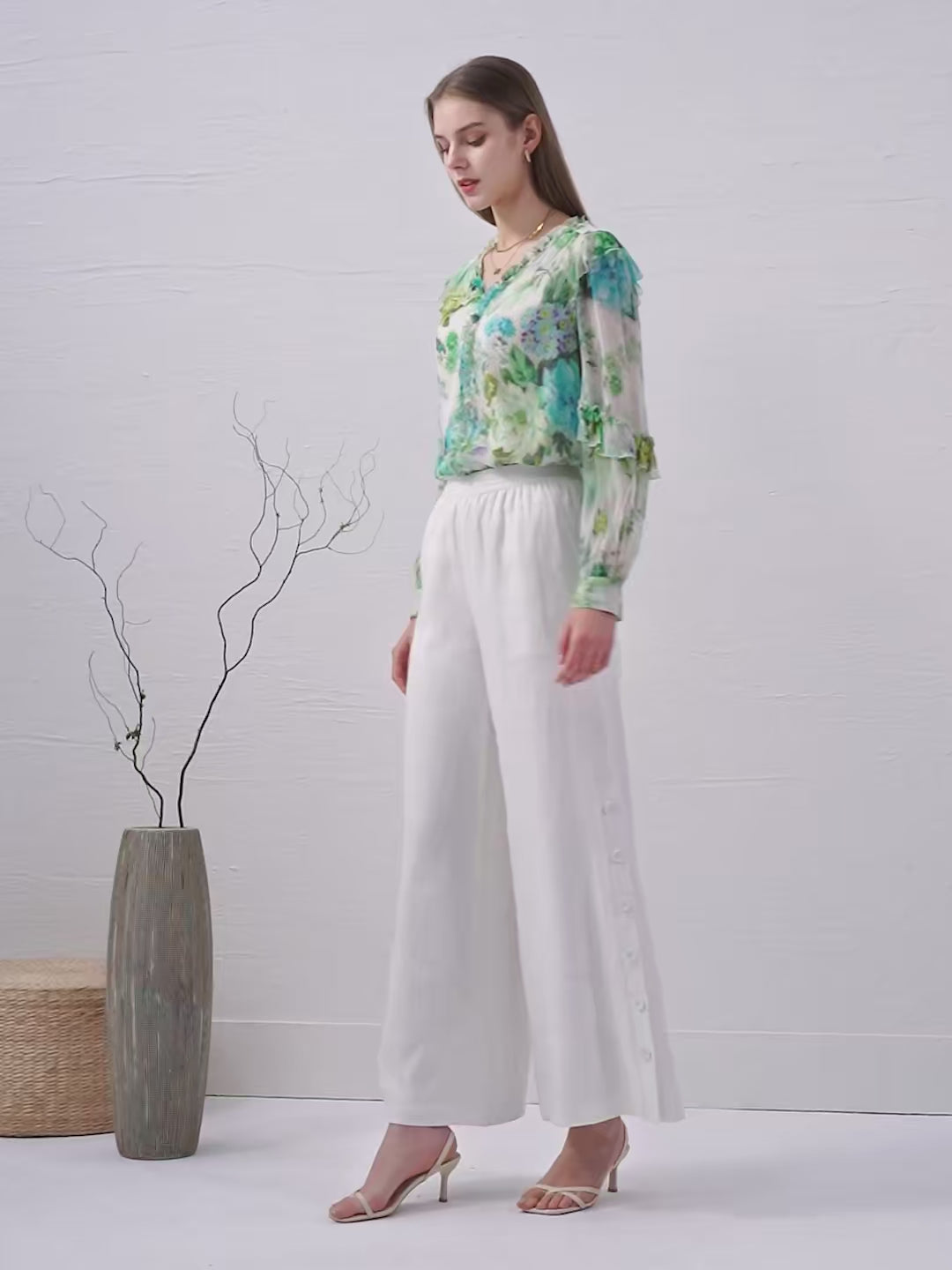Switch up your summer dress for the perfect summer blouse, Rosie. It's a romantic silk blouse that features botanical prints in summery blues and greens with subtle pops from other colours. It has romantic ruffling detailing down the front and along the shoulders for a flowy finish. Even the sleeves flow out into tiered layers to create an eye-catching look. It's loosely fitted for an extra breezy look that encourages you to feel the summer breeze through your hair. Wear Rosie to summer picnics, parties, or even barbeques. All you have to do is thrown on a pair of jeans or some flared white pants, and your summer look is complete.
