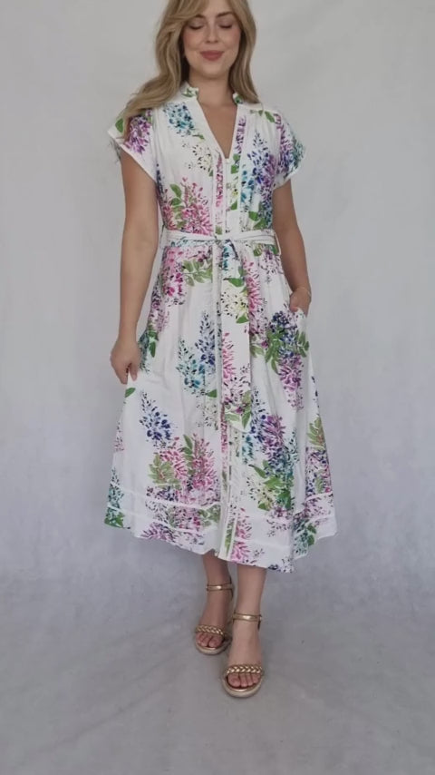 This charming midi dress features a delightful watercolor-style floral print in vibrant hues of purple, pink, and green. The short sleeves, V-neckline, and belted waist create a flattering and feminine silhouette. The overall design is both playful and sophisticated, perfect for a variety of occasions.