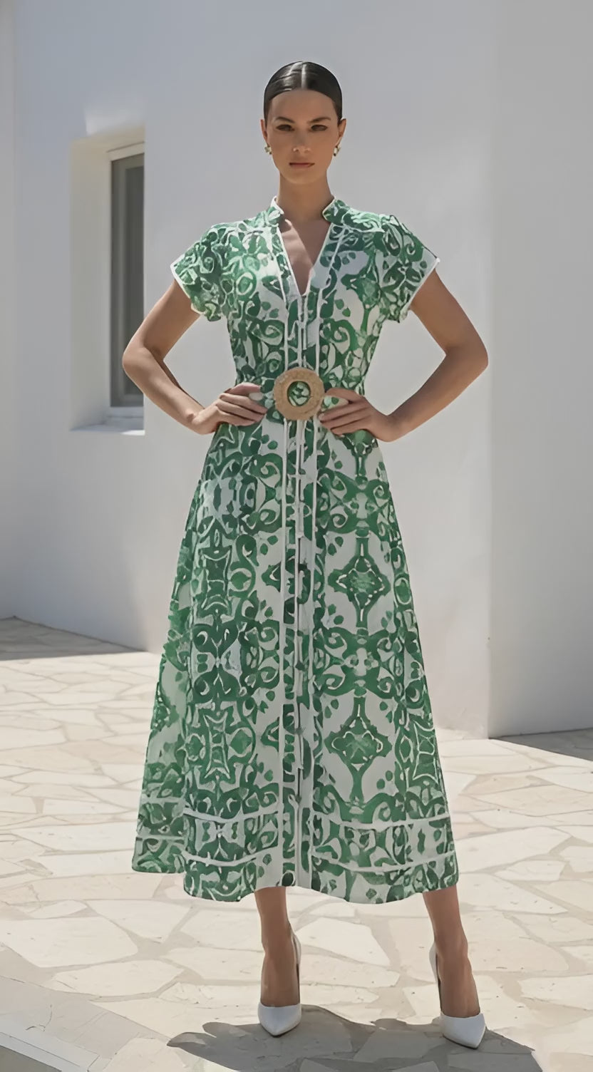 Elevate your wardrobe with the Estelle Dress in Green—a sophisticated piece that commands attention wherever you go. The eye-catching geometric print paired with a graceful, flowing silhouette creates an instantly polished look that works beautifully for both leisurely escapes and special occasions.