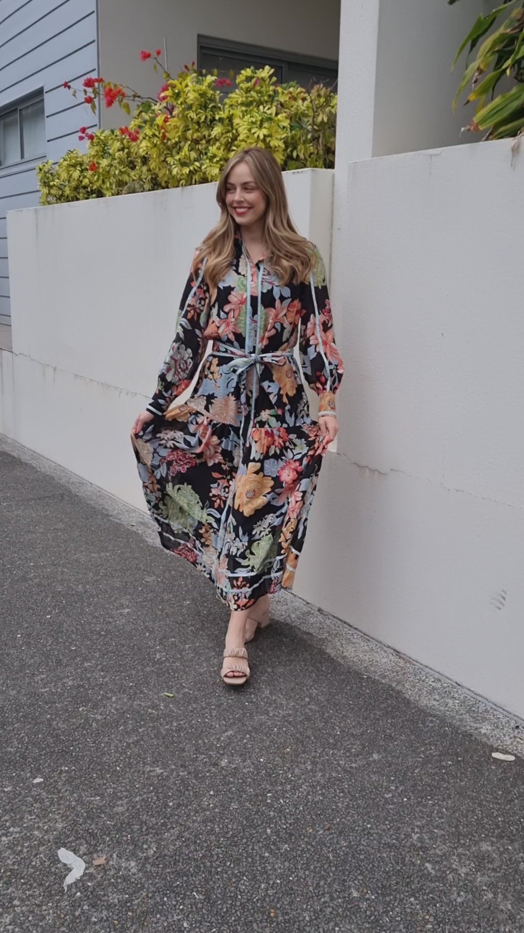 Elevate your wardrobe with the Florida Dress. A striking floral print, bold and eye-catching, adorns this midi-length dress. Long sleeves with subtle puffing, a collared neckline, and a cinched waist create a flattering and feminine silhouette. Delicate pastel piping adds unexpected detail. The lightweight fabric offers a comfortable and breezy feel, perfect for any occasion.