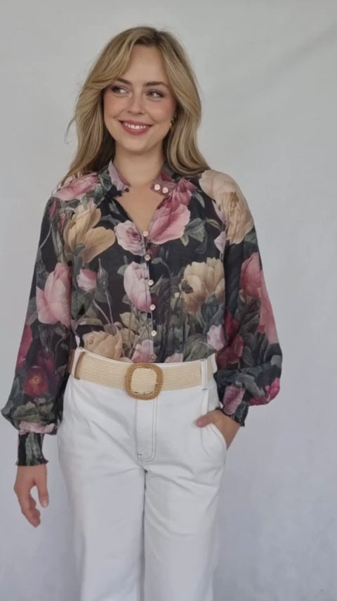 This blouse is a romantic and sophisticated piece. The dark background is beautifully adorned with a lush floral print featuring a variety of roses and other blooms in shades of pink, burgundy, and cream. The long sleeves and relaxed fit create a comfortable and elegant silhouette. The subtle detailing at the cuffs and the button-front closure add a touch of refined charm, making it a versatile option for various occasions.